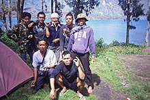Lake)の神秘の蒼が眼下に広がっていた。2050mの高さにこれだけ広大な湖を抱えていて、その上この湖は釣りのメッカで地元の人たちに恵みを与えている。湖には、噴火によって生まれたGunung Baru(新しい山)という富士山の小型版みたいな山が浮かんでいる。湖畔へ降りてみると、大きな鯉が釣れるということで大勢の人たちが釣りを楽しんでいた。わたしたちも湖畔のキャンプ場でランチタイム。ジャワ島から来た若者グループがいて、コーヒーや釣りたての鯉の塩焼きをご馳走になり、一緒に写真を撮ったりと盛り上がった後、なぜか彼らに国歌を歌って欲しいとせがまれ、ビデオカメラの前で「君が代」を歌うはめになってしまった。この湖のそばの沢には温泉も沸いていて、地元の人たちは気持ちよさそうにマンディ(沐浴)している。わたしも入りたいところだが、水着も持ってないし足湯で我慢をした。パンツ1枚で温泉に浸かるブルハン君はとても気持ちよさそうだ。キャンプ場に帰ると、さっきの若者たちから購入した魚をから揚げにしてランチが出来上がっていた。長い休憩を終え(4時間近く湖畔にいた。本当にのんびりなのだ)、2900mのキャンプ地を目指してやっと出発する。ところどころ急な岩場が出てくるが、天秤棒&ビーサンのペンリさんは絶妙なバランスで越えていき、ガイドのブルハン君は10歩登っては息切れで立ち止まるという状態。まだ28歳の若さでこんなに体力なくて、今後彼の仕事は果たして成り立つのか?キャンプ地には既にドイツ人パーティとオーストラリア人&チェコ人パーティ、アイルランド人という様々な国の人たちがいて賑やかだった。夕暮れの空は息を呑む美しさ。きょうは人がたくさんいるので昨夜ほどの静寂ではないが、様々な国の人たちと夕焼けを眺めるという経験もいいものだ。慣れない英語に疲れると、ガイド&ポーター達が囲む焚火の輪に混ざり、ロンボクの言語ササッ語をBGMに焚火はいいなあと日本の沢を懐かしく思っていた。