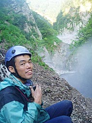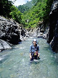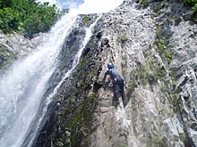 少し休んで、すぐ階段状の小滝を越えると、30m大滝となった。右壁が登れるとなっている。須田さん、空身で滝の水流右に取り付いたが、上部が悪く、ロアダウンで降りてきた。「またやっちゃった〜!」といいながら、今度はルンゼに取り付いて登っていった。続いて私が登るが、垂直の泥壁で、太い枝が何本も垂れているので難しくはないが、足場がツルツルで、ものすごい奮闘を要し、腕パンプ寸前、最大の核心部であった。甘く見ると、しょっぱい思いをするということのようだ。須田さんは残置したハーケンをトップロープで回収した。