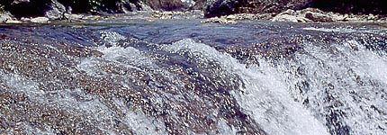 薬研沢からいよいよ遡行開始、強い流れの中、スクラムを組んで進む。ここが浦島だろう。強い流れに、私は須田さんのザックにしがみつき、何とか後ろから進むこともしばしば。ここは自分がトップなら進行を躊躇するところだ。背の低い人にはちょっと無理ではないかと思った。私の緩いスパッツは終始足首のところに下がりっぱなしで、かえって抵抗となった。