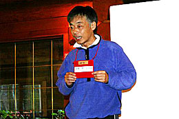 最後が宴会の出し物である。実は宿を選んでいる段階から「金色夜叉」は決めていたので、本来であるならば舞台が不可欠であった。舞台の袖で松倉が松の木になりすまし「お宮の松」を演じる。演じるといっても動かない松だから簡単なものである。それならば名札をつけて「お宮の松倉」としたらウケるだろうか。件の場面では漆黒の夜空に満月が煌々と輝いていたらしい。そうだ、満月ならばボウズ頭の岩崎が適任だ。実際に二人はよく手伝ってくれた、ありがとう。