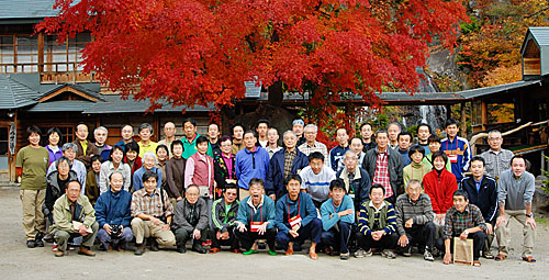 私は単純に、昨今低迷しているわらじだから、わらじの仲間だけで集まりOBも現役も皆ひとつになって温泉で大騒ぎがしたかった。場所の選定には時間をかけた。記念誌の座談会で若さんに相談したら「不動の湯」がいい。さらに諸先輩に相談すると、わらじのルーツだから「甲子温泉」がいい。10周年でつかった「湯西川温泉」はどうだ。とさまざまな意見があった。八丁の湯にしたのは二つ理由があります。ひとつは料金が安かった。もう一つは露天風呂の向こうに滝が落ちていたから。実は私の頭にはある記念写真の構図が描かれていた。現役もOBも、老いも若きも、男も女も、みんな一緒になって露天風呂に入る。バックには八丁の湯名物の滝が落ちており、そこには全裸で腰にバスタオルを巻いて登攀する人物がいる。さらに滝の落ち口には横断幕がかかり「祝わらじの仲間50周年記念」と書かれているのであった。