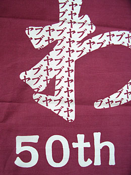 次に企画したのは記念品である。50周年を記念した思い出に残る品。う〜むなんだろう?名入りで安価なものをと物色した。めんぱ、箸、コップ、Tシャツ、手拭い。各種の商品群を吟味し、各種業者を打診して、最終的に本染めの日本手拭いに決めた。柄は秋の集中で丸山岳の山頂に集まった者同士で決めた。やや酒も入っていたので落ち着いて眺めてみると滑稽なデザインだと思う。実はこの手拭いにもひと波乱があった。最終の型紙を承認して発注したのが遅すぎて、業者から記念式典に間に合わないことが告げられた。私はクレーマーと化し「納期については最初に譲れない条件と申し上げたじゃないですか」と凄んでみた。しかし返ってきた言葉に驚き萎縮してしまった。「努力はいたしますが香川の天気次第では……」。そうなのか四国で作っているのか、こりゃ本物だ。天気が相手なら仕方ない、運を天に任せるしかない。ところが11月1日(前々日)にその業者から電話が入り、香川県が好天続きだったので明日、商品を送れる。ときた。ワハハ、ミッションインポッシブルとはこのことだ。