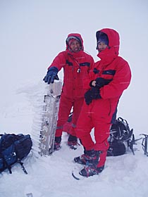 1397mピークにスキーをデポし、ワカンを履いて、クラスト気味の尾根を進む。八久和川を左手に見て、遡行した時のことを時々思い出しながら、ラッセルを繰り返す。最後、ちょっとした急登となり、風雪で視界のないピークに立った。約3時間、予想より時間はかかった。