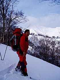 橋本荘の前でシールを付け、大井沢沿いの林道にスキーを滑らせる。ここでも雪は降っていなかった。少しすると、後ろから土建屋のおじさんがワゴン車で来て、我々を拾って、工事現場まで乗せてくれた。除雪の終点で車を降り、再び林道をラッセルで進む。足首から臑あたりのラッセルだが、スキーの威力で着実に進む。やがて雪がちらついてきた。