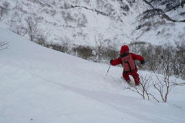 遅くなったが、風もなく高曇りで安定し、遠く富士山、槍ケ岳なども見渡すことができた。交信でトマはもう滑りきってシールをつける状況とのこと。我々は、14時30分に滑降開始し、年齢順に滑り降りた。高妻山頂のわずか北側から、少し開けた雪面めがけて滑り下りる。思ったより傾斜は強くない。1、2ターンして右手の藪に入り、薮を抜けて、まっすぐ降りると見事な大斜面が開ける。アイスバーンぽい上に新雪がたまっているので気をつけないとスピードが出てしまい、それを止めようと制動をかけると表層雪崩を誘発してしまう。実際に事故が起こるというほどのものではなかったが、誰かが上部で急停止した際、勢いで小雪崩が発生し、早い速度で谷筋を流れた。