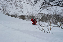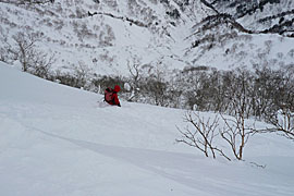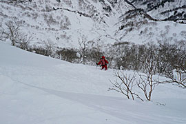 快適な斜面はしばらく続いたが、やがて狭い沢沿いの形状となり、滝が露出しているところが2か所あった。いずれも左岸から横滑り等でかわした。下部へ行くほど雪の締まりがなくなり、私の短い板では普通に滑っていてもトップが沈んで刺さってしまい、頭から転んでしまうような状況となり、少々手こずった。結局、尾根末端までスキーでは行けず、途中でシールをつけて右岸を巻いて2297mピークへの尾根末端にたどりついた。トマパーティはこのときまで佐渡山のコルで私達のために待機していてくれた。