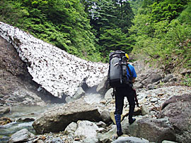 翌日も滝の下降が続いたが、すぐに緩い地形となり、室谷川に合流した。出合は滝になっているが左岸から巻き降りられる。室谷川の下降を始めるとすぐに巻けないトロがあって泳いだ。その後は、ハイペースでゴルジュの中をヘツリと巻きで下降した。大きな雪渓が3か所くらいあったが、問題なく通過できた。駒倉沢の出合の滝は右岸の踏み跡をたどる。