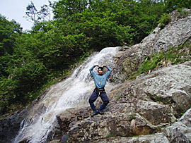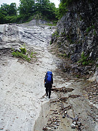 翌朝、林道を歩き終点から沢に下りる。ゴルジュの中、これといった滝もなく、トロを胸まで水に浸かって通過したりしていく。小さな雪渓が3つあった。ルートファインディングが悪いため、駒形山へは左俣の1本手前の1005mピークに詰めるルンゼに入ってしまった。すると、幸か不幸か、視界には見事なスラブが開け、思わずハーフドームを彷彿させるような見事な光景に感激した。下段をフリーで登っているとき、急にボフッボフッというような動物の声が聞こえ、振り向くと大きなツキノワグマが10mくらい下の、滝の落ち口付近を走って通過していった。これには典ちゃんも喜んだ。スラブとクマが大きな収穫となった。スラブ上部は典ちゃんリードでロープ1ピッチで抜けた。