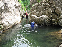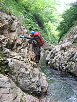 コルから岩魚沢に向かっていくと自然に沢型になり、地形図でもそれとわかるように標高850m付近から急降下する。右側の尾根を伝い、その後、15m滝を1か所懸垂した以外は楽に下れ、下降に適した沢である印象を受けた。