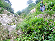 幕場から続く小滝をショルダーやロープで切り抜けていく。細長い釜に守られた8m滝は容易に超えられず、左岸の斜上バンドをトラバースし滝身の脇の凹角へとロープを伸ばす。そして、最後の15mくの字の滝が越えるとほぼ滝場は終わり、左岸から流入する一本目の枝沢から9時半には稜線に抜け、小尾根伝いに東大鳥川の西ノ俣沢へと下降していく。