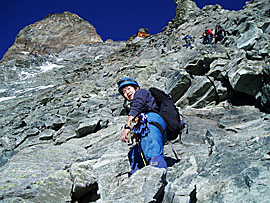第2クーロワールの先で稜線から赤と白のロープが垂れているところがあり、本当はこのロープ沿いに登るべきところを、ちょっと急だったので巻き気味にガラ場に入ってしまった。すると、上方にいたロシア隊が落石をして、大きな石が多数、私めがけて落ちてきた。びっくりしたが、石を最後までしっかりと目で追っていたら、私の目の前で左右に分かれて、両脇を落ちて行った。ちょっとラッキーだったかもしれない。マッターホルンは、落石での事故が多いらしい。