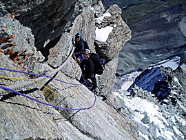 先生が登ろうとしたので、私たちも続いて登ることにする。ソルベイ・ヒュッテのすぐ上は、出だしホールドが甘いけれど、一歩上がればすぐに傾斜が落ちて、稜線上に出る。ここからはロープなしでも行けそうだけれど、よくわからないのでロープをつけたまま稜線上をスタカットで登る。確か、1ピッチ半くらいでコンテに変え、東壁側に回り込むと、白いロープがフェースに張られていた。ルートは、10m直上して左曲し、10mトラバースして尾根に上がっている。最初、白いロープにプルージックをかけて行こうかと思ったが、先生からロープを引いてくれといわれて、ロープを出した。