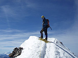 肩の少し上でまた岩稜になり、細い雪のコルを通過し、東壁側から回り込むようにして岩を登って稜線に上がった。すると、また雪稜となり白いロープが絶壁の下まで張ってあった。ここまで肩の上から3ピッチ。ロープ帯はグリップのいいゴム手袋を使って、ゴボウ3ピッチで登れた。その上は、また急な雪壁となったが、すでにステップが階段状になっていて安定していた。そんな斜面を、4ピッチ登ると山頂だった。聖者の像は、懸垂下降しようとする人たちが使っていて、最後、スタンディングアックスでを迎えた。